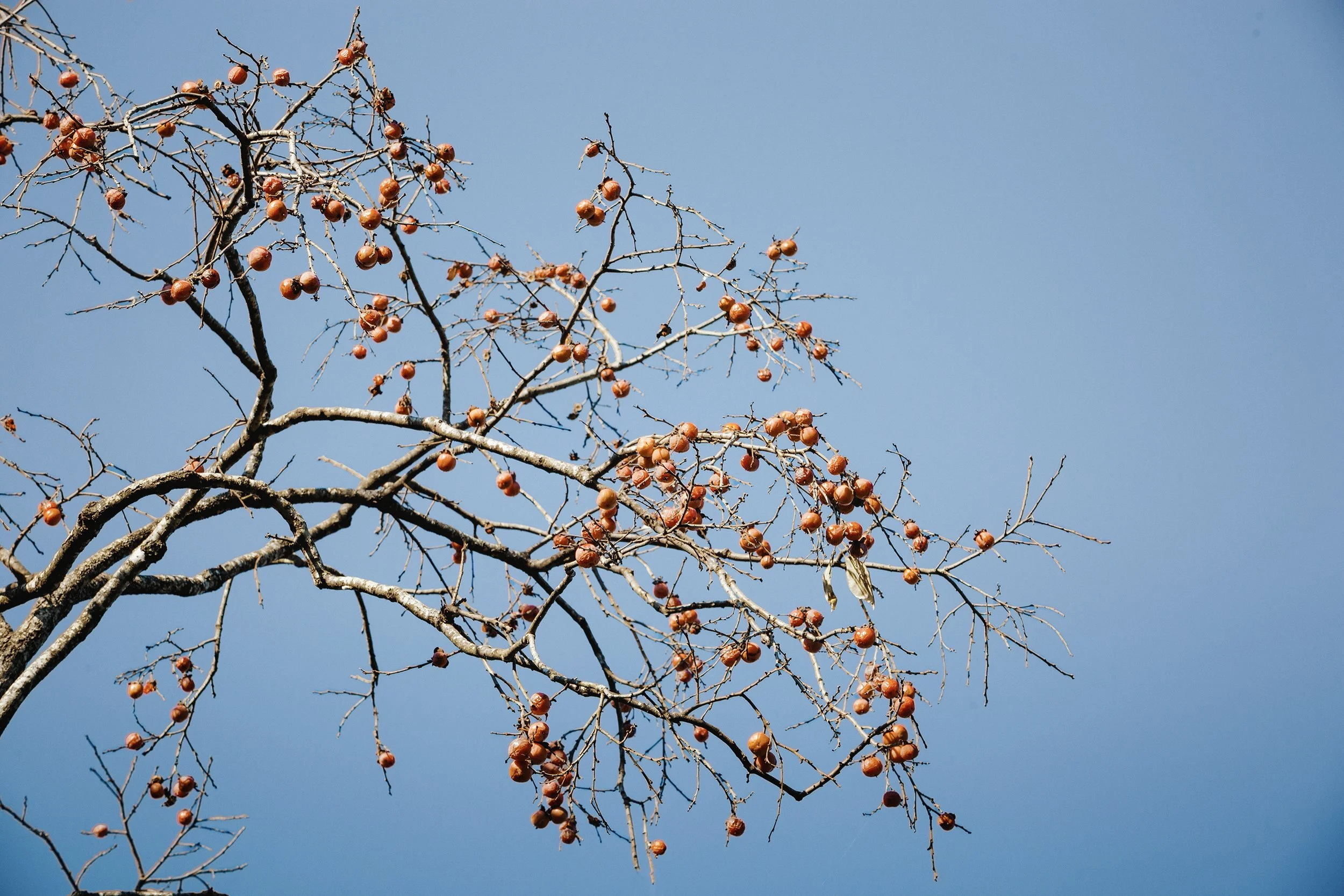 It’s challenging to find views of the tree that showcase its beauty. Some years I focus on the bark, other years the berries. In 2022 I managed to photograph the tree with lush leaves and nearly ripe persimmons. Another year I dragged a few branches home and styled the persimmons for still life pictures. This year I walked around the cemetery behind Berea Church and studied the tree in crisp morning light as a committee of vultures congregated on the water tower above. Happy to see my old friend.