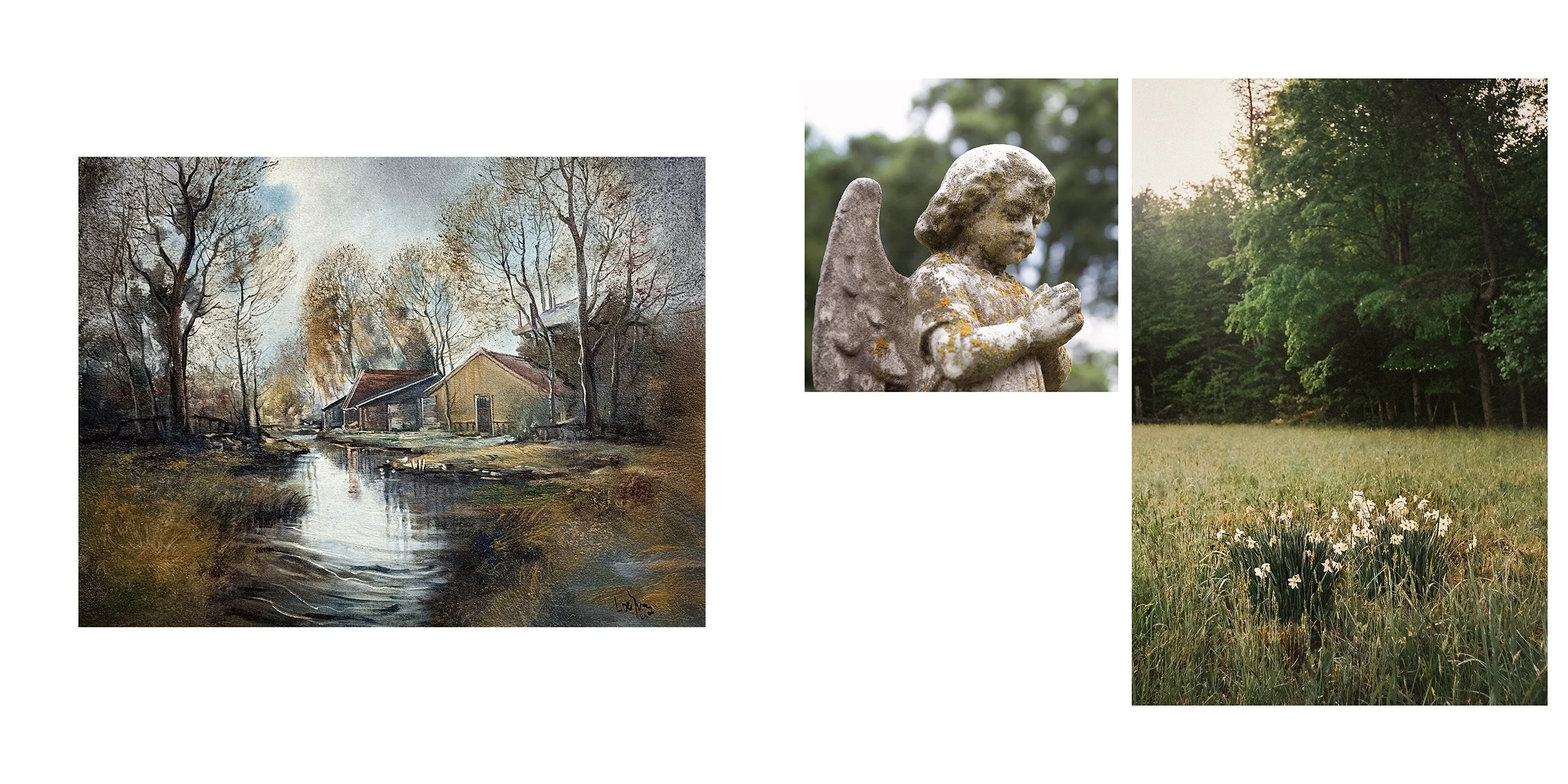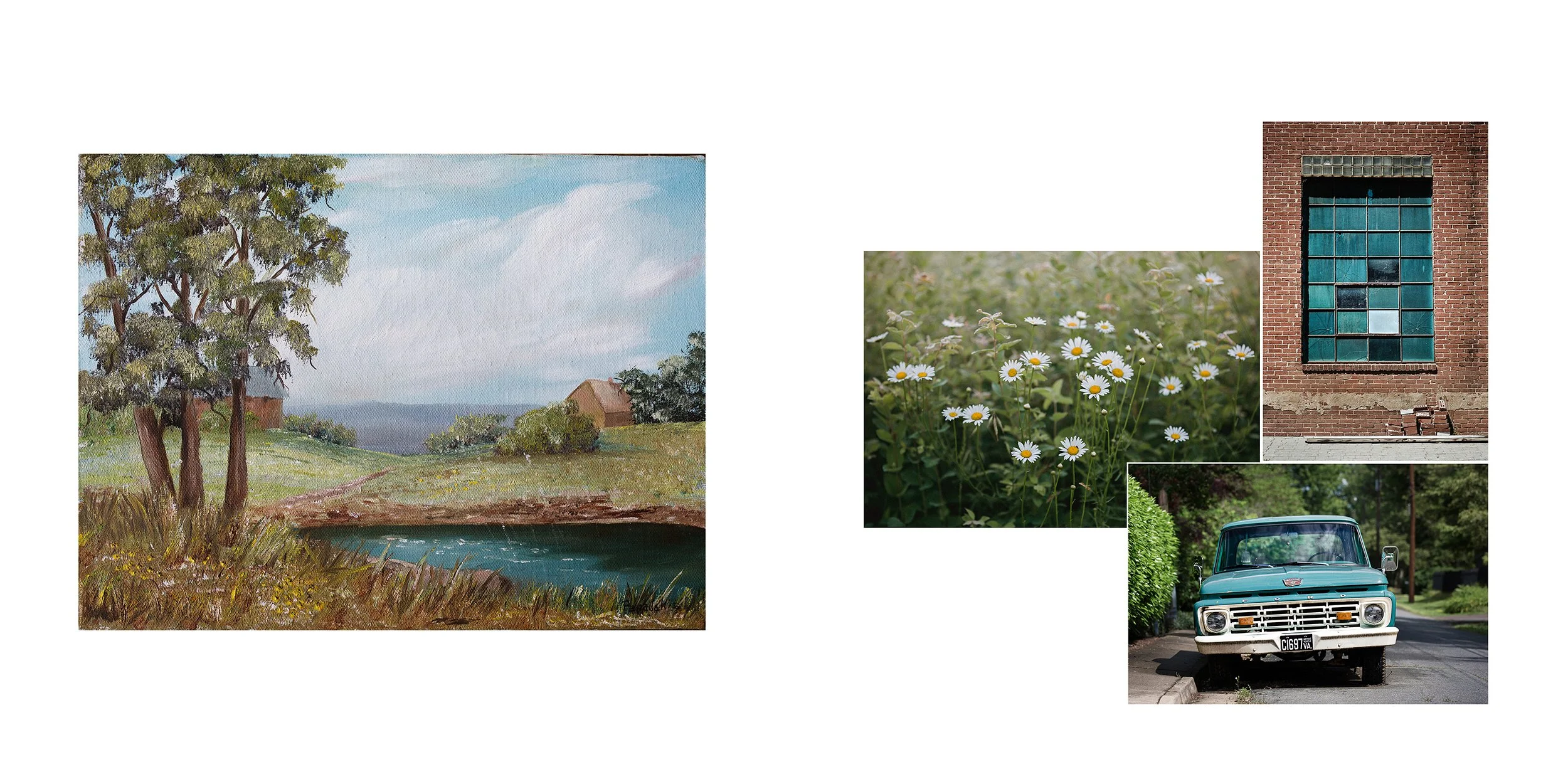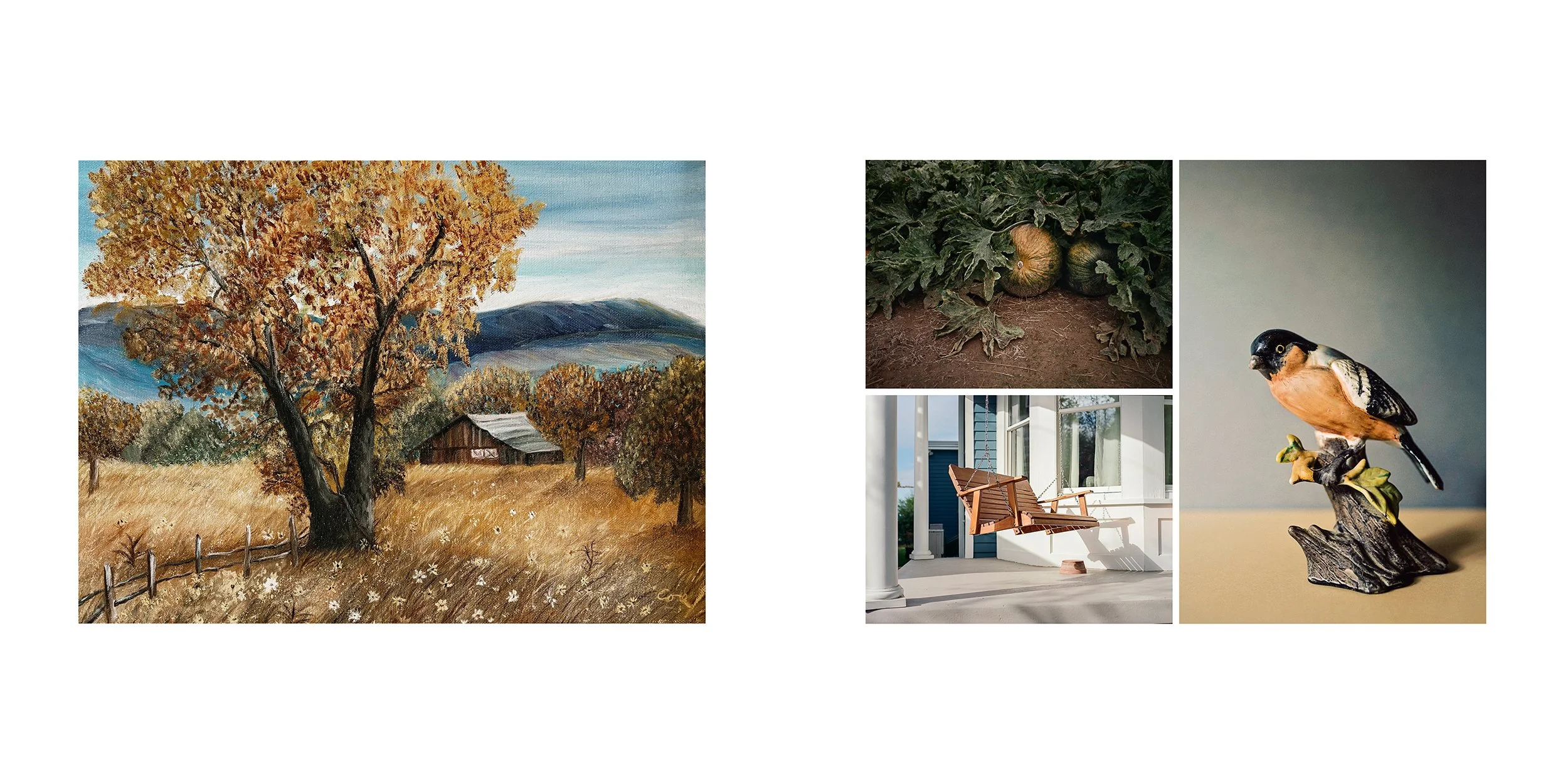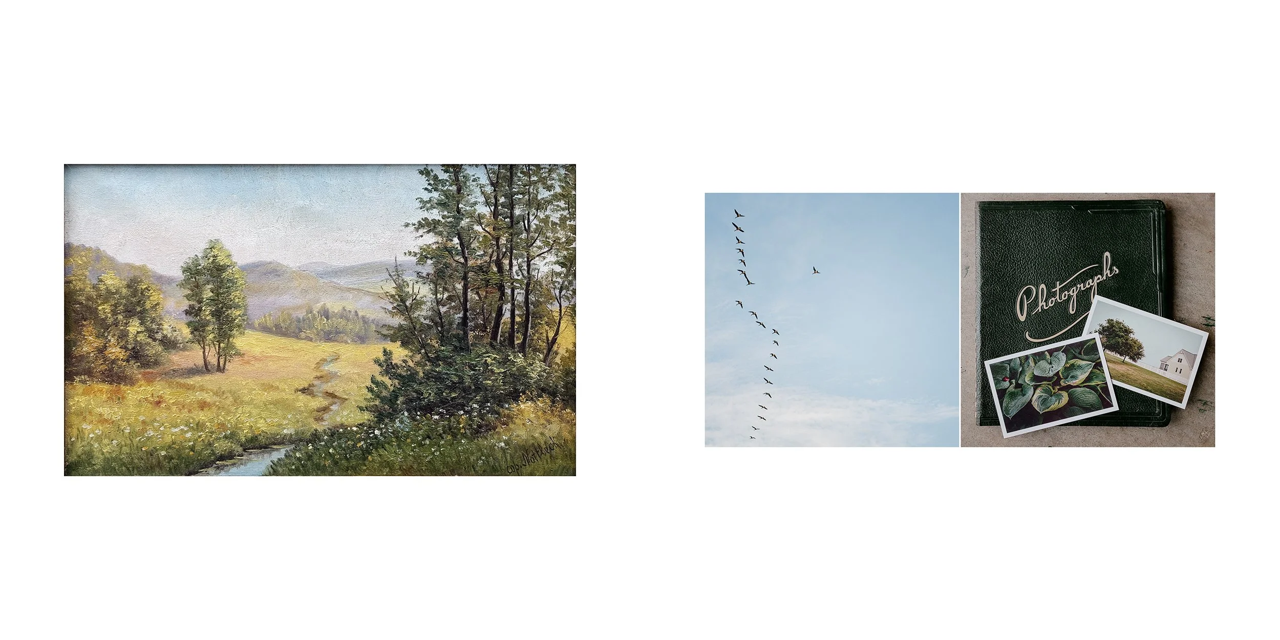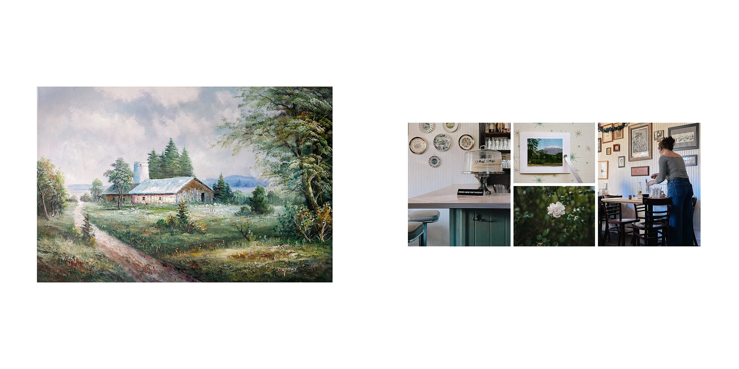 The project is centered around a collection of vintage landscape paintings found at local thrift shops and antique malls. Some of the paintings are signed and dated, and every effort was made to credit the artist. But many are not signed—leaving the authorship a mystery. The paintings share some common contexts. Most are of rural landscapes, and all reflect a deep connection to natural environments. Many feature cabins or old homesteads, winding paths, ponds, bridges, fences of one kind or another. The paintings are spread across the four seasons. Many share similar color palettes and all are oil paintings. I endeavored to photograph the paintings with accurate representations of color and brush strokes. In every case, my goal was to witness and honor the original paintings.