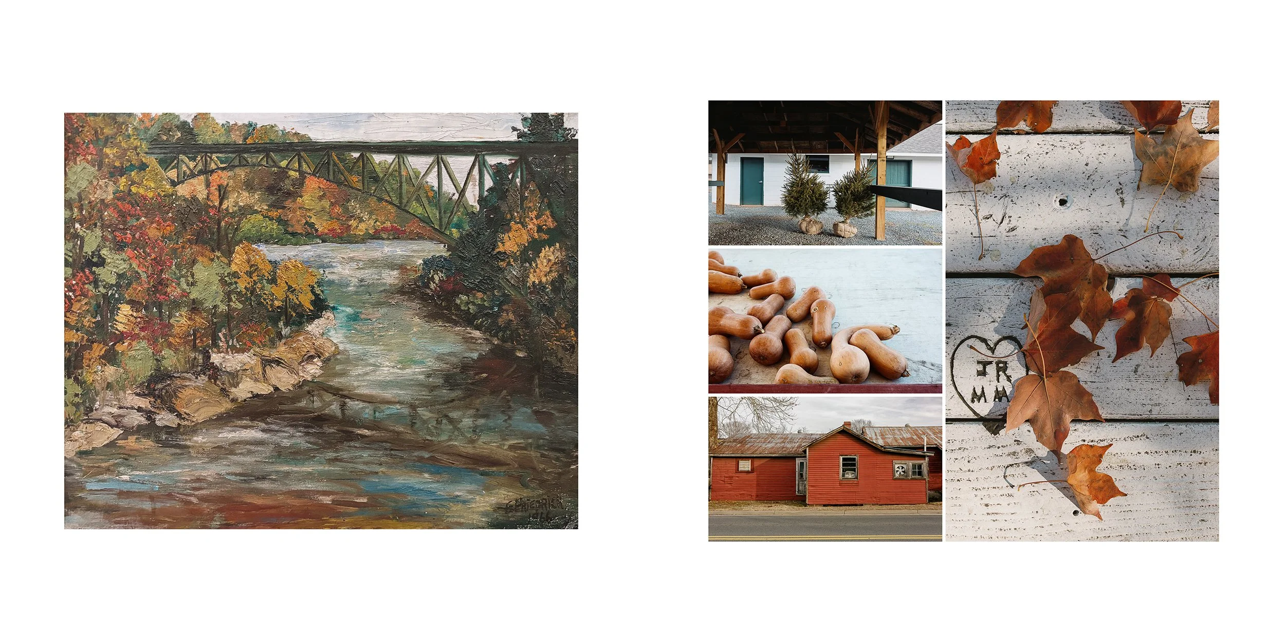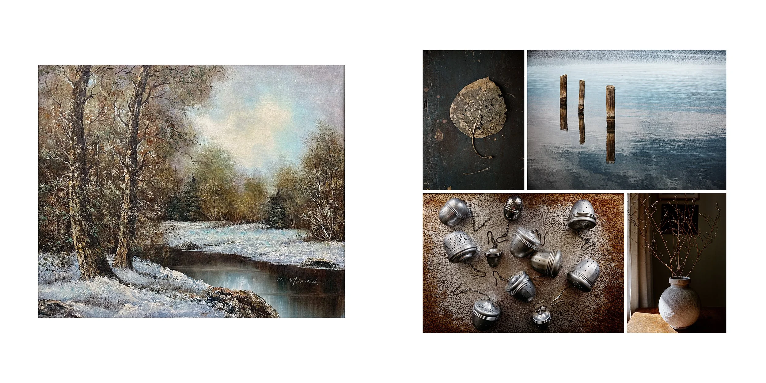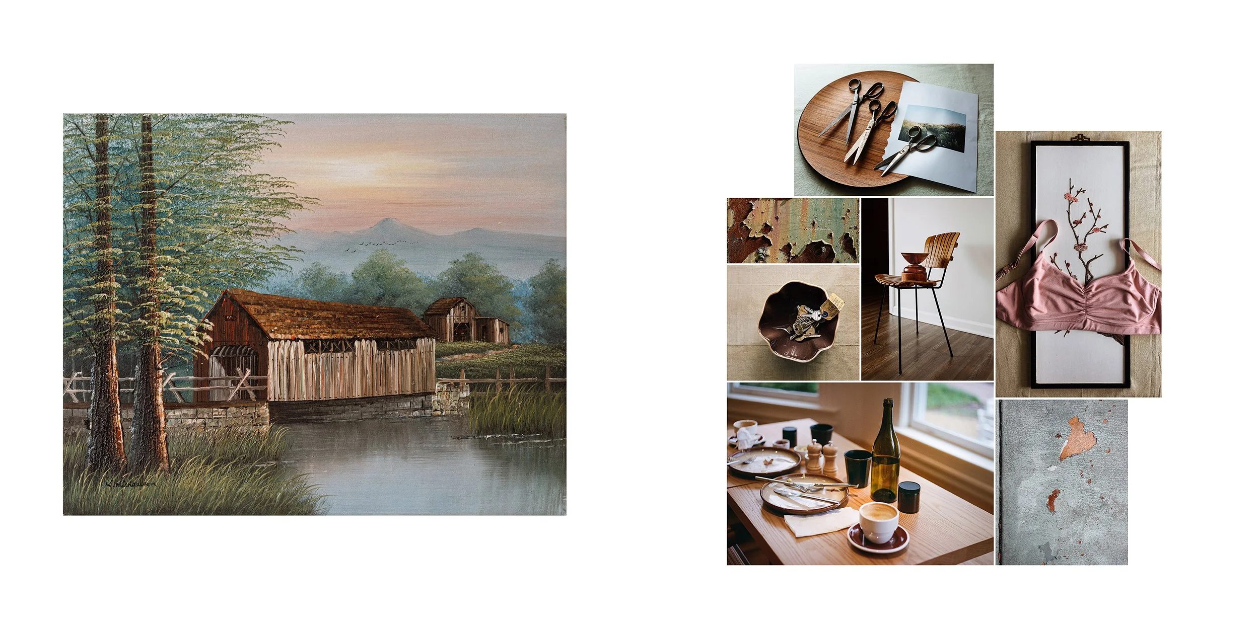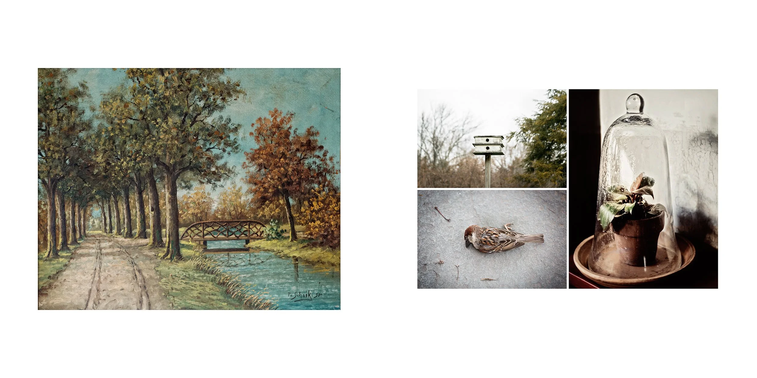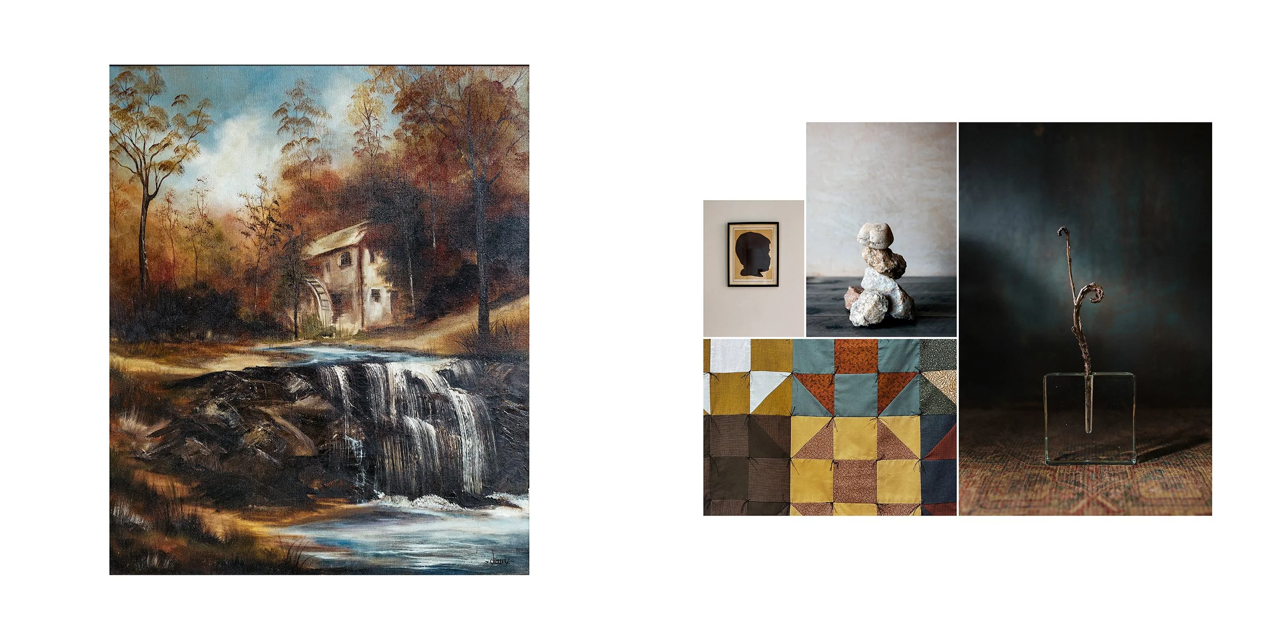The project is centered around a collection of vintage landscape paintings found at local thrift shops and antique malls. Some of the paintings are signed and dated, and every effort was made to credit the artist. But many are not signed—leaving the authorship a mystery. The paintings share some common contexts. Most are of rural landscapes, and all reflect a deep connection to natural environments. Many feature cabins or old homesteads, winding paths, ponds, bridges, fences of one kind or another. The paintings are spread across the four seasons. Many share similar color palettes and all are oil paintings. I endeavored to photograph the paintings with accurate representations of color and brush strokes. In every case, my goal was to witness and honor the original paintings.