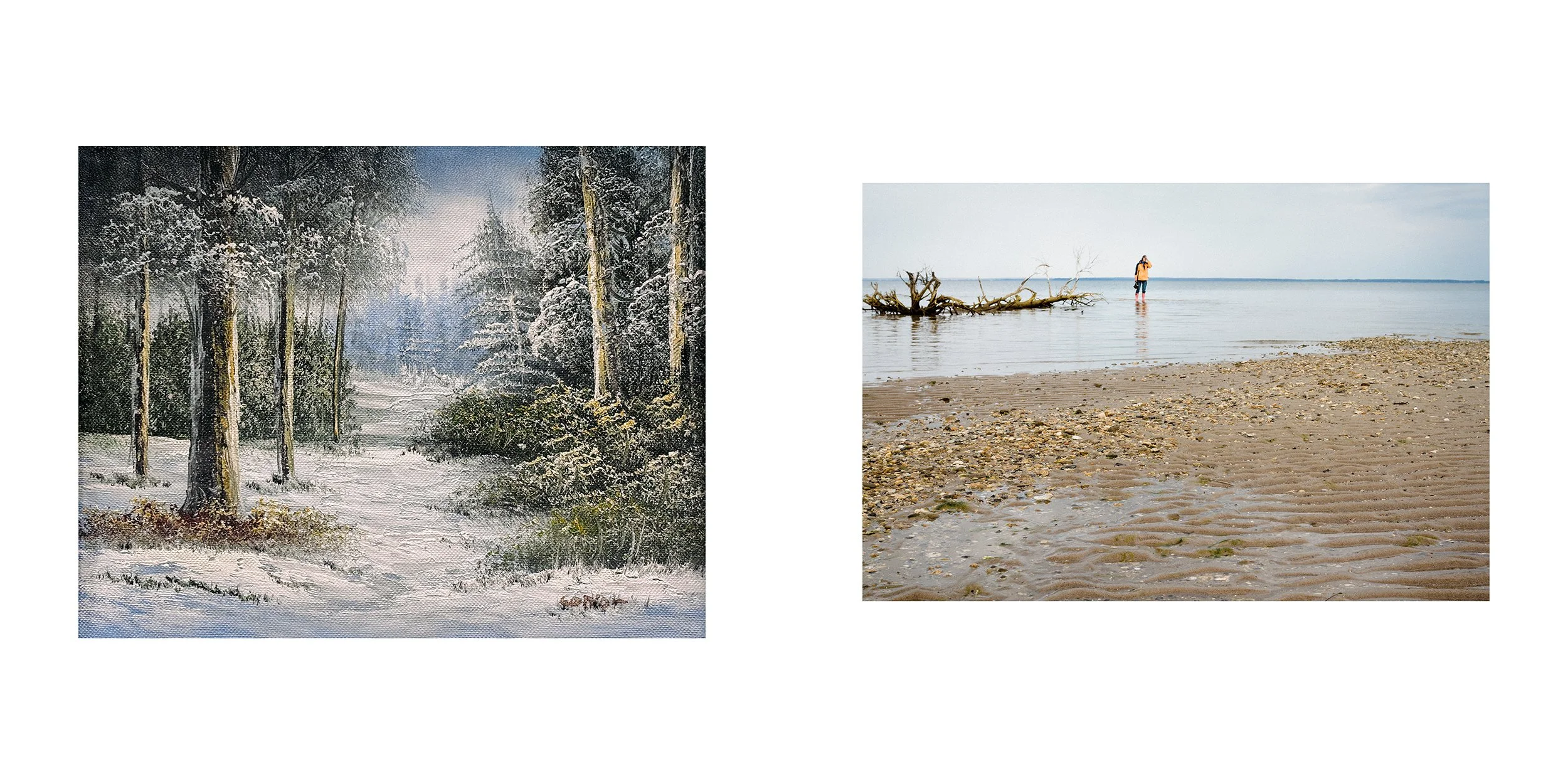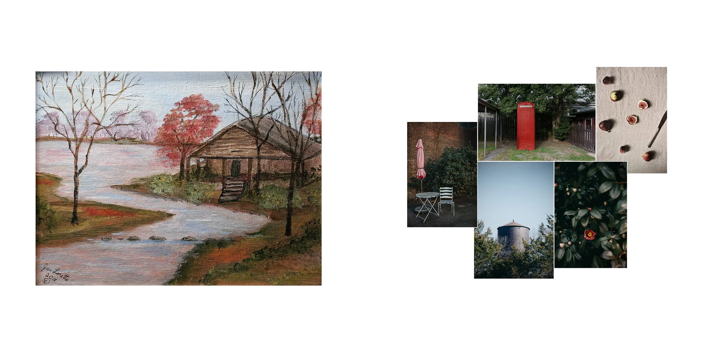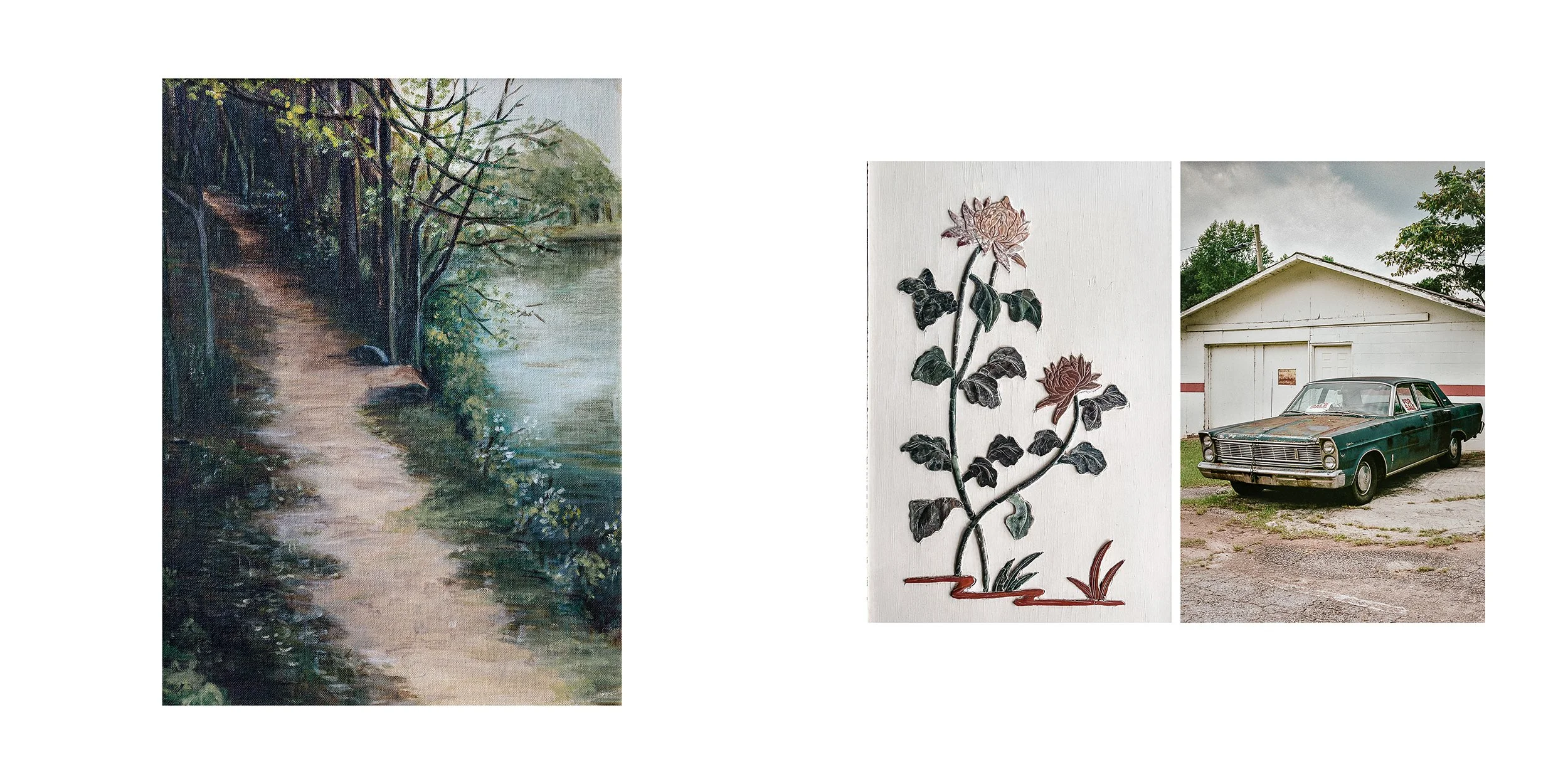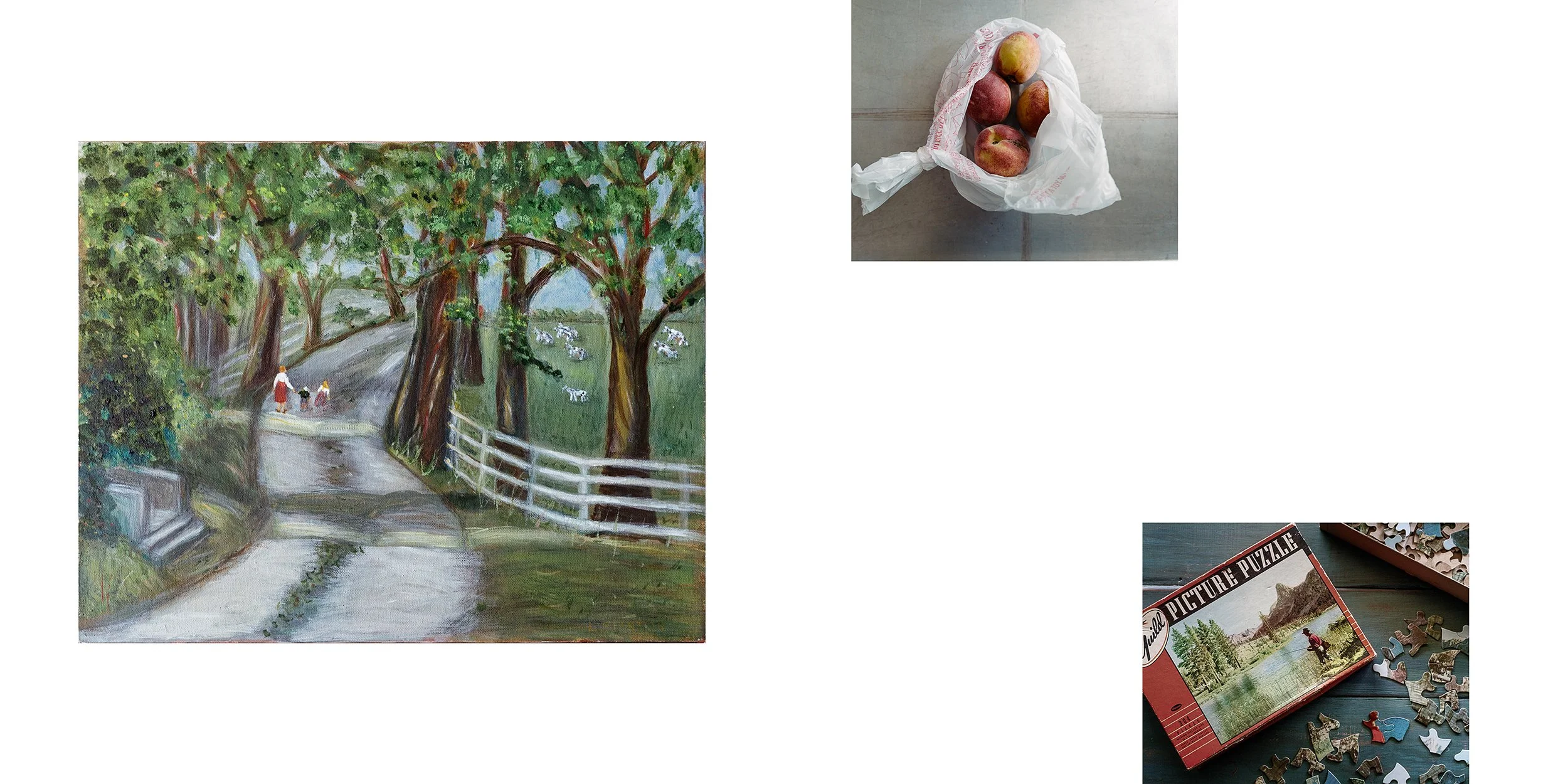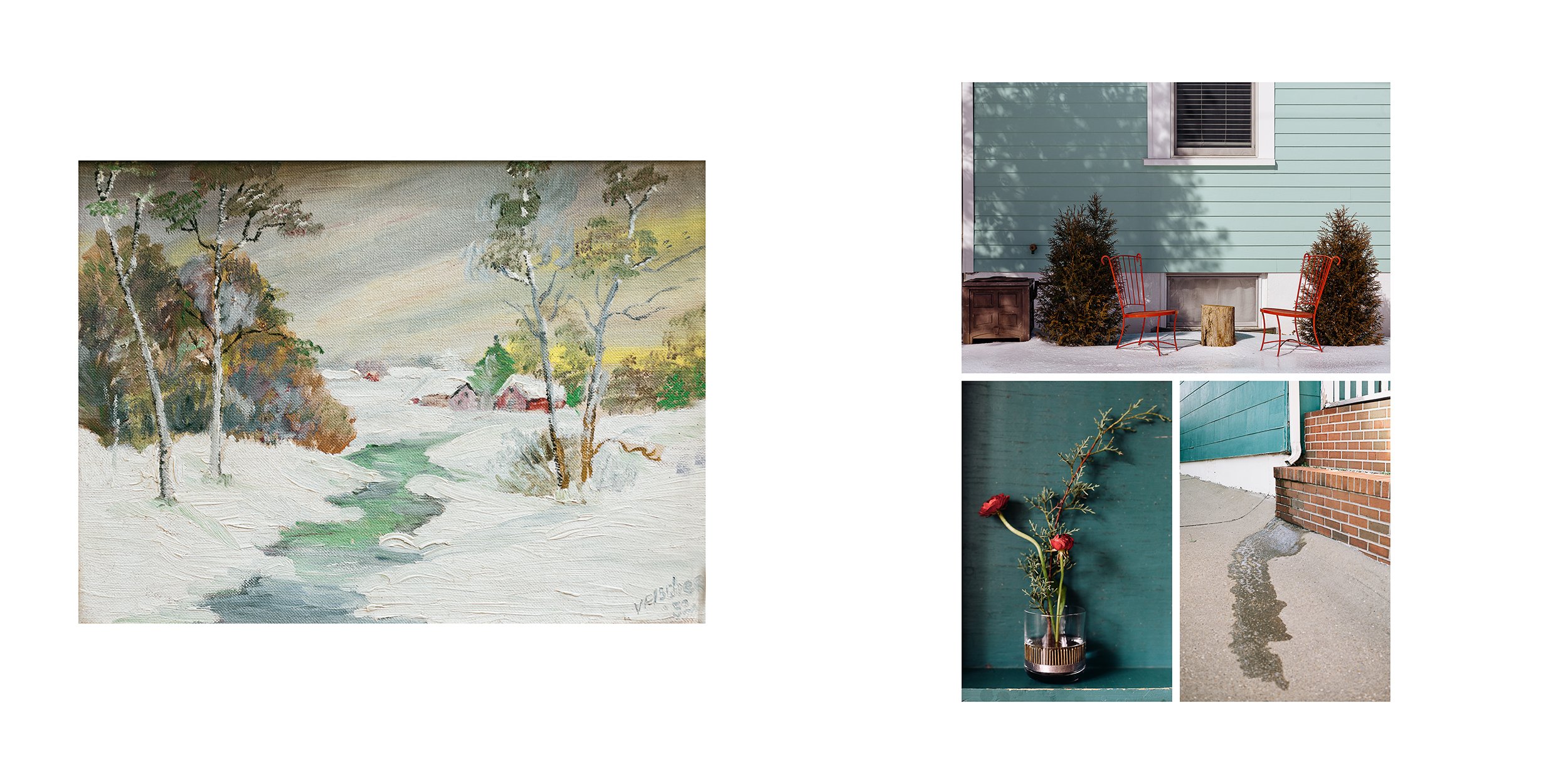 The project is centered around a collection of vintage landscape paintings found at local thrift shops and antique malls. Some of the paintings are signed and dated, and every effort was made to credit the artist. But many are not signed—leaving the authorship a mystery. The paintings share some common contexts. Most are of rural landscapes, and all reflect a deep connection to natural environments. Many feature cabins or old homesteads, winding paths, ponds, bridges, fences of one kind or another. The paintings are spread across the four seasons. Many share similar color palettes and all are oil paintings. I endeavored to photograph the paintings with accurate representations of color and brush strokes. In every case, my goal was to witness and honor the original paintings.