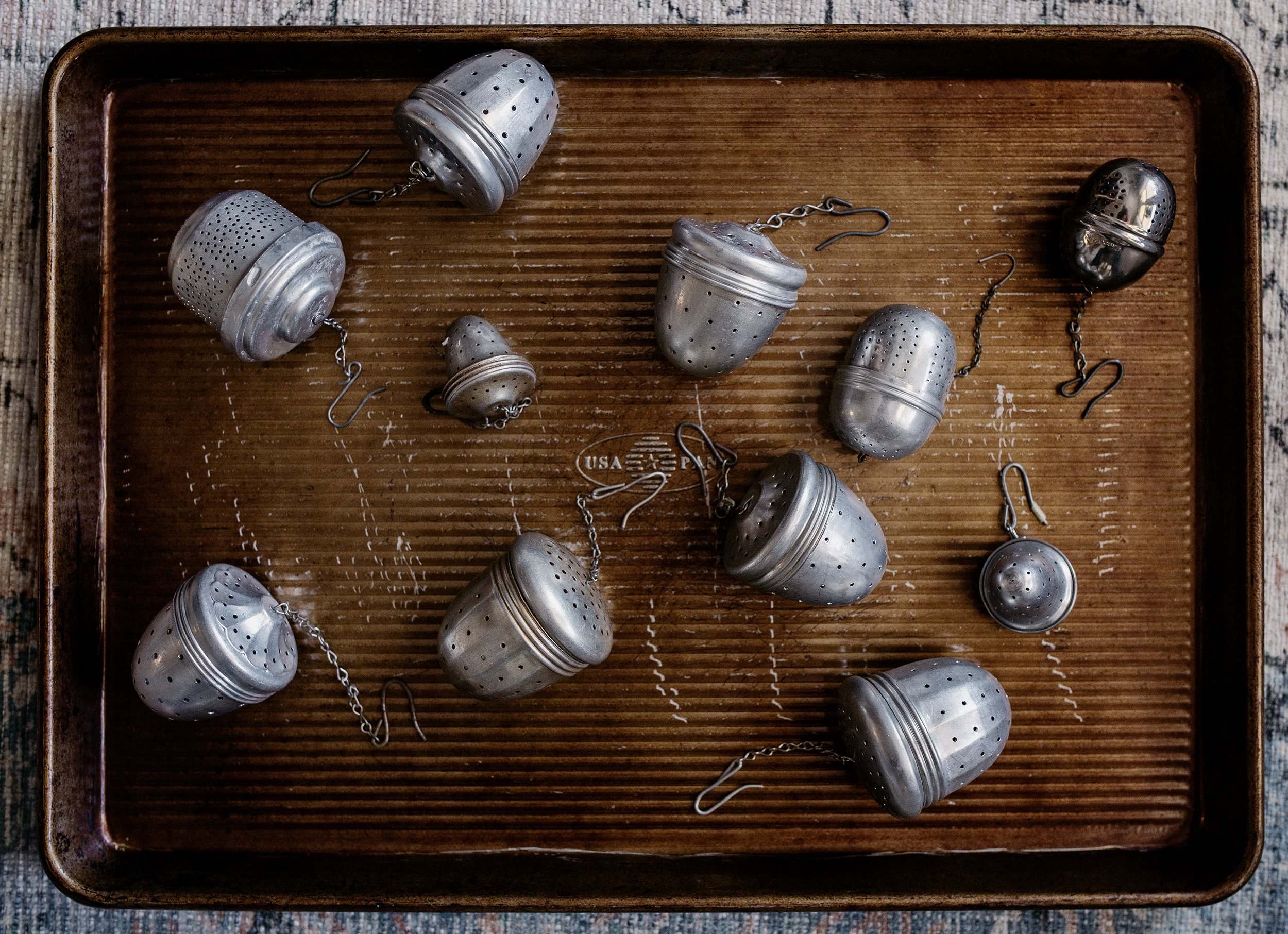 Because I couldn’t decide which version of this photo I like best, there are two notebook entries for this collection of tea infusers. We love what we love, and for me, things that combine form and function are the most beautiful.