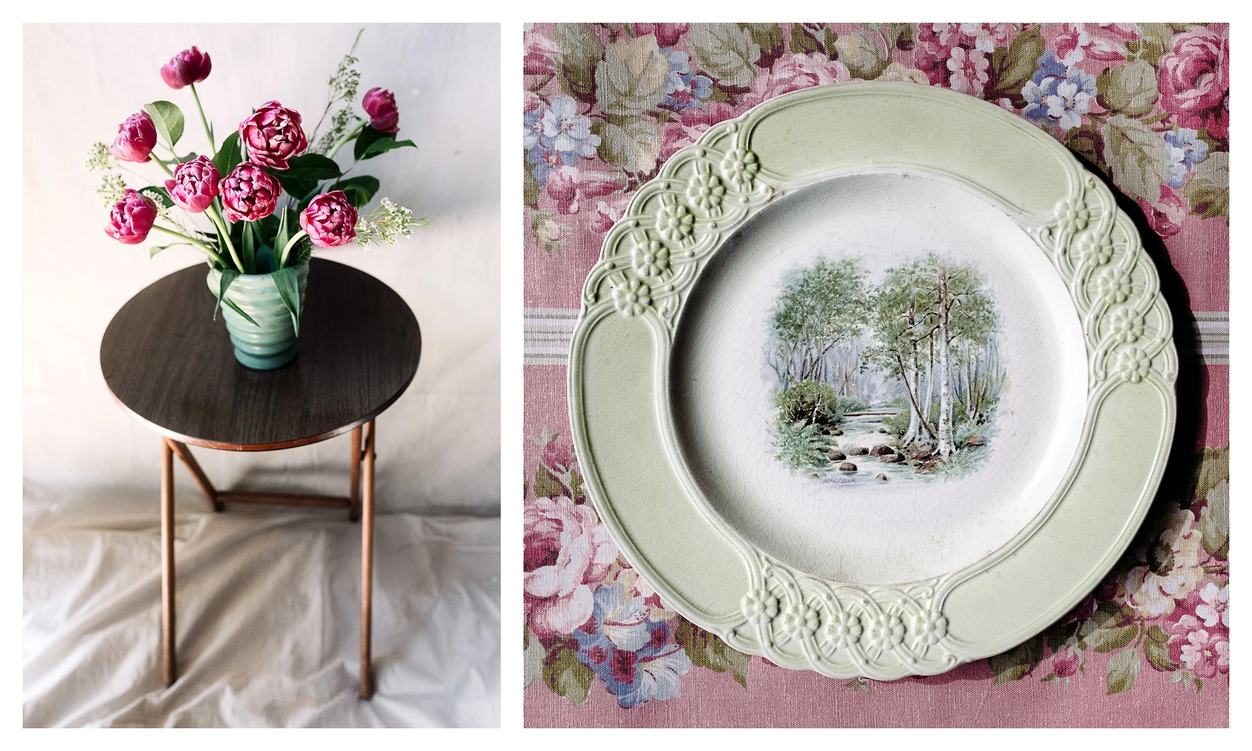 I have been dreaming about photography works all week. Not every photo makes into the project. And sometimes I have to let go of ideas that just don’t work—like this picture of a landscape scene on a plate. There is something deeply romantic about a plate that tries so hard to be more than a plate. This one takes you on a walk through the forest. The tulips are the first installment in my spring flower subscription (a fresh bouquet every week for 6 weeks). I’m having that feeling of anticipatory anxiety where everything is going so well . . . and I’m anxious that I’ve forgotten to worry about something, like how I might fall off of this cliff at any moment. But what if it’s really the worry that IS the falling off the cliff ?