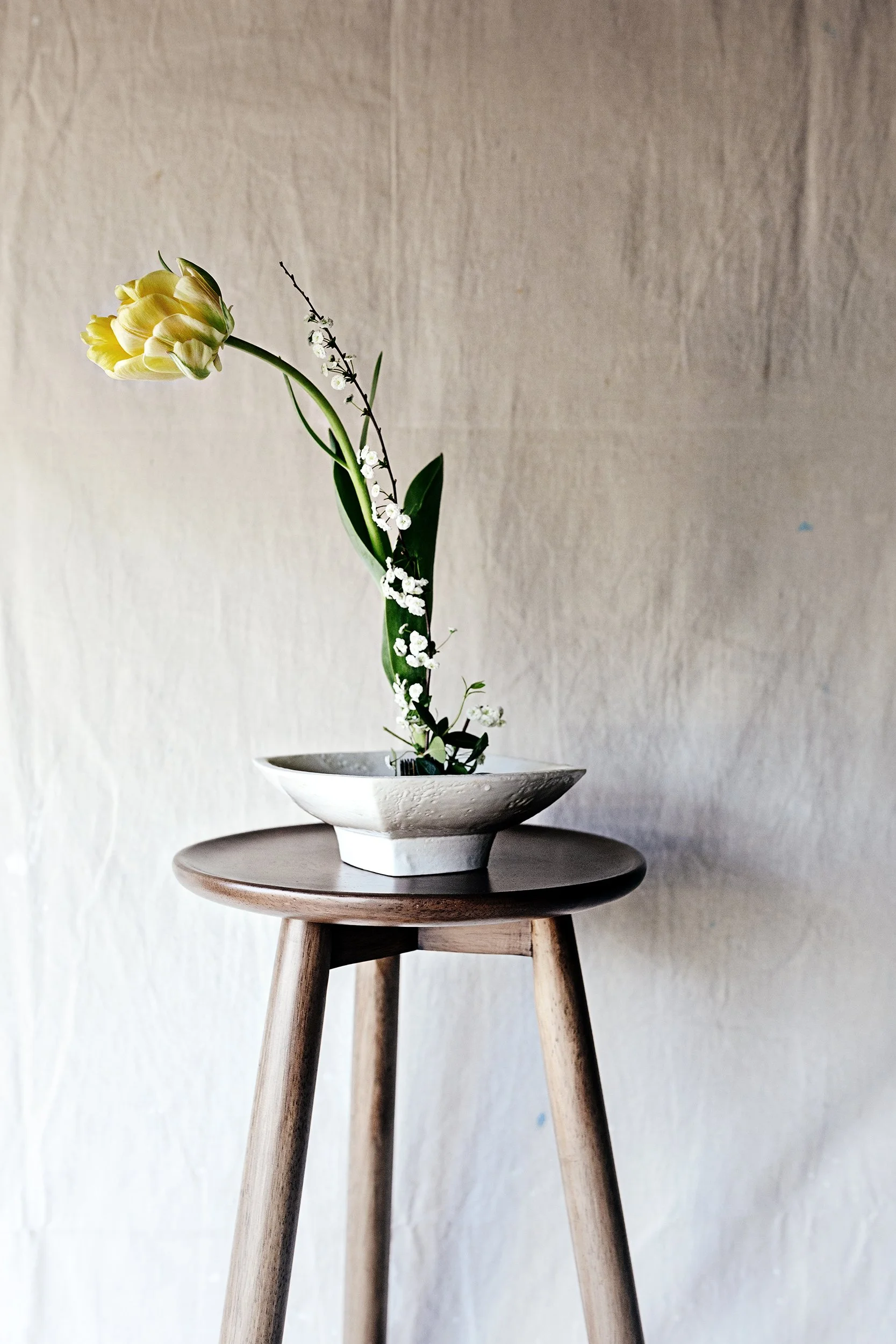 “Make it alive and vital by adding a few flowers: a tulip, 1 broad tulip leaf and a spray of mimosa, all impaled on a small pin holder.”
